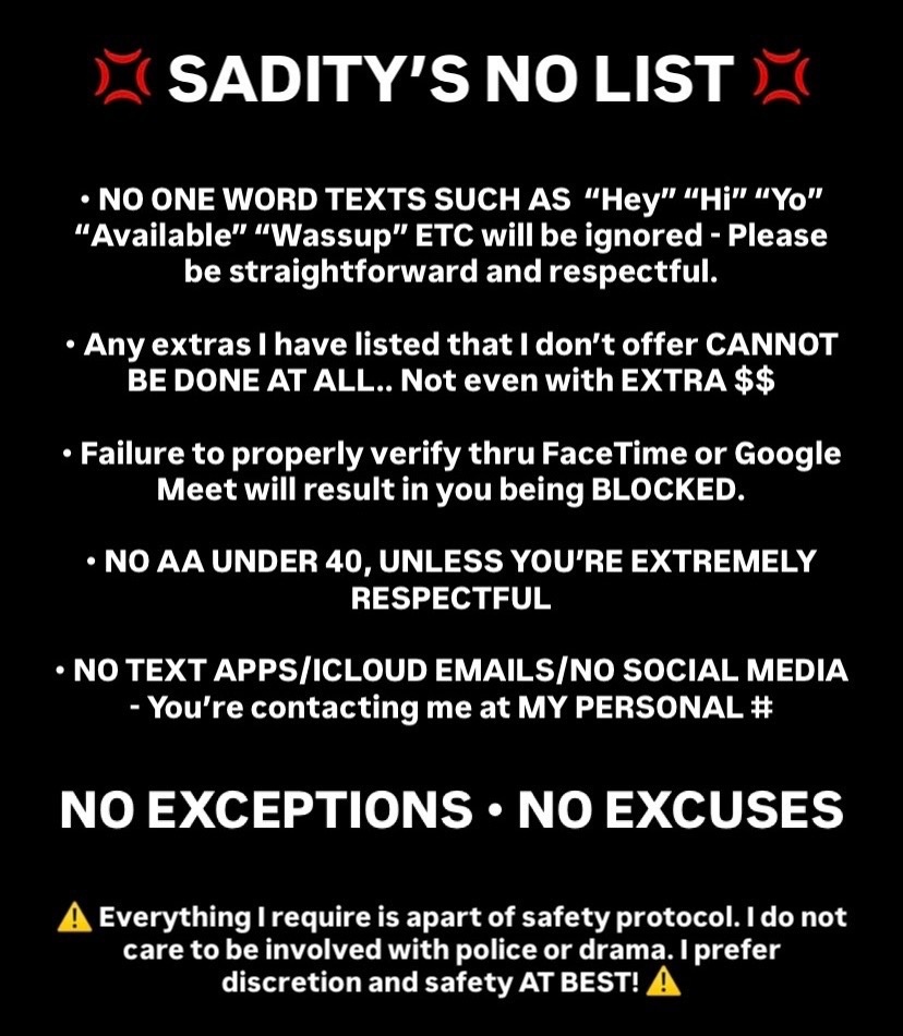 ๐ฝ๐พ๐๐๐พ๐ธ๐ถ๐๐๐น. ๐๐๐๐ถ๐๐ ๐๐๐ & ๐๐๐ถ๐น๐๐ฆ ๐ Mesmerizing from my gorgeous face ๐ to my petite frame. If youโre looking for pleasure SADITY is your treasure ๐ I LOVE respectful, polite, generous, & CLEAN GENTLEMEN (NO AA Under 40) ๐ซ โโโโโโโโโโโโโโโ------------------------- ๐ ๐ข๐๐๐๐ฅ ๐ง๐๐ ๐๐ข๐๐๐ข๐ช๐๐ก๐: โข Incalls & Outcalls (W/ Uber/Lyft Or Deposit) ๐ โข Nuru Massage ๐๐ฝโ๐๐ฝ (EXTRA$$) โข Fetish Friendly ๐ฃ๐งด โข Trucker Friendly ๐ Offerings๐งง: - Fly Me To You Dates ๐ฉ - Dinner Dates ๐ฝ - Shopping ๐ - Private LapDance ๐๐ฝ - ๐ก๐ Overnight / All Day / Weekend - ๐ซ NO BARE , NO DATY , NO GFE , NO ANAL โ